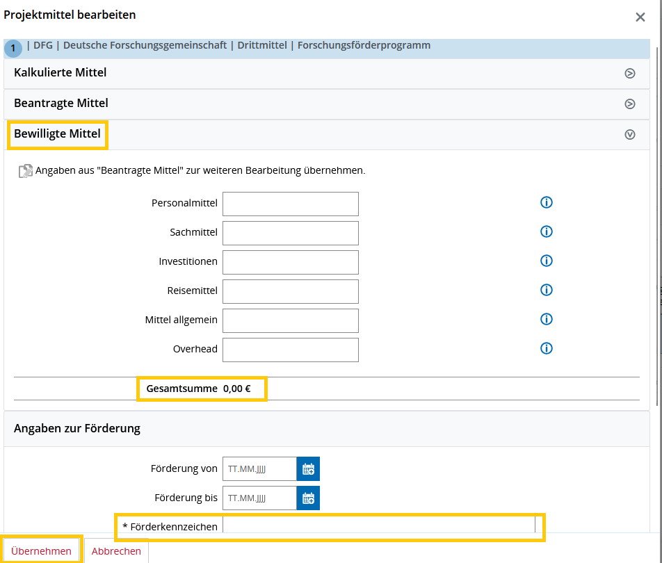 Es öffnet sich ein Overlay zur Eintragung der Mittel. Darin können Sie die kalkulierten, die beantragten und die bewilligten Mittel angeben. Da im FIS derzeit bewilligte Projekte erfasst werden, ist nur die Eintragung im Bereich „Bewilligte Mittel“ zwingend notwendig.