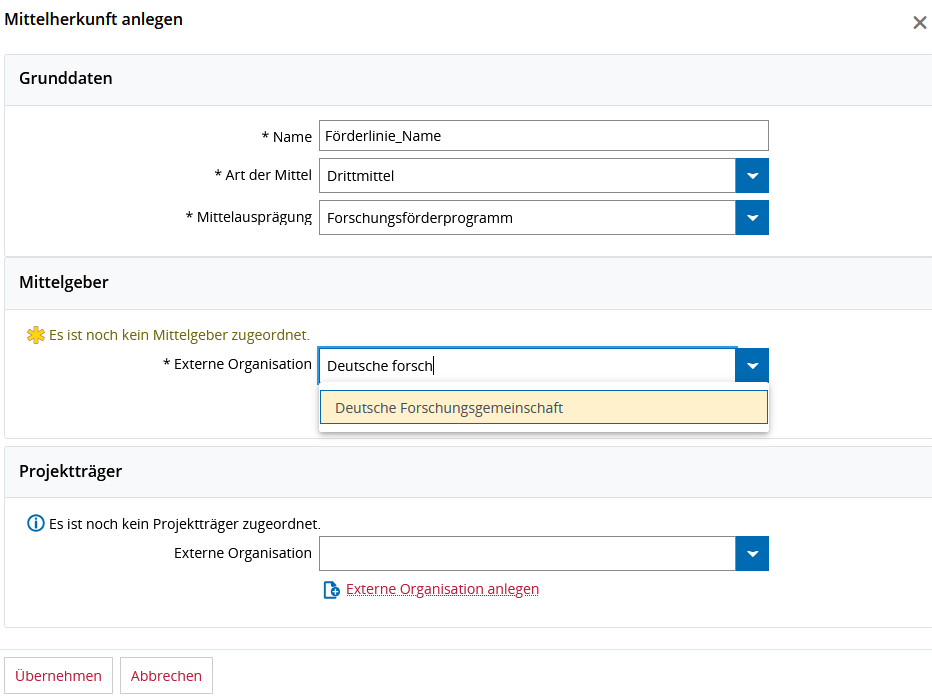 Beim Mittelgeber handelt es sich um die Organisation/Firma, von der die Mittel stammen. Sie können nach bereits vorhandenen externen Organisationen suchen und diese übernehmen, oder eine neue externe Organisation anlegen. Gleichermaßen gehen Sie im Falle eines Projektträgers vor. Speichern Sie am Ende über Klick auf „Übernehmen“