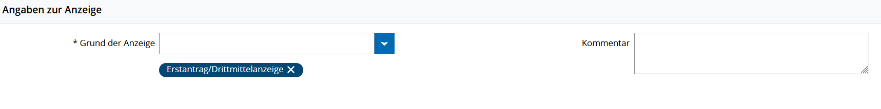 Wählen Sie oben den *Grund der Anzeige, z. B. „Erstantrag/Drittmittelanzeige“. Nutzen Sie bei Bedarf das Kommentarfeld, für Mitteilungen an Abteilung 21 oder Prüfpersonen.