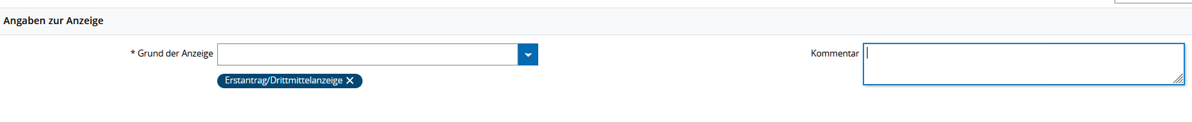 Wählen Sie oben den *Grund der Anzeige, z. B. „Erstantrag/Drittmittelanzeige“. Nutzen Sie bei Bedarf das Kommentarfeld, für Mitteilungen an Abteilung 21 oder Prüfpersonen.