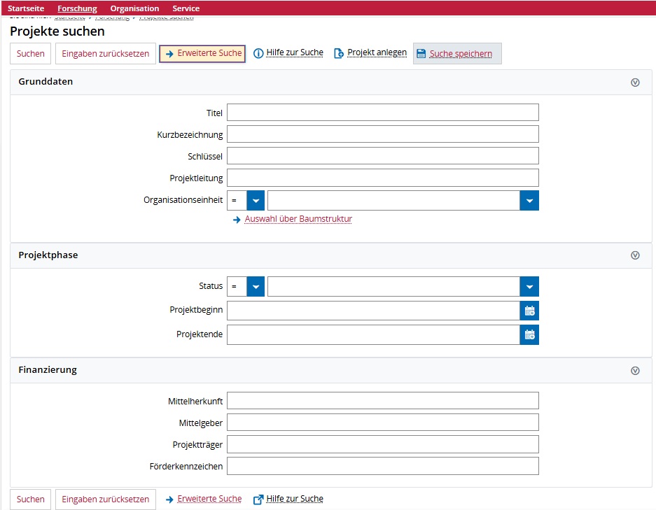 In der Suchmaske können Sie bestimmte Projekte suchen oder aber mit einer Suche ohne Suchkriterium alle Projekte der TU anzeigen lassen. Die Suche über alles blendet nur versteckte Projekte anderer Organisationseinheiten aus.