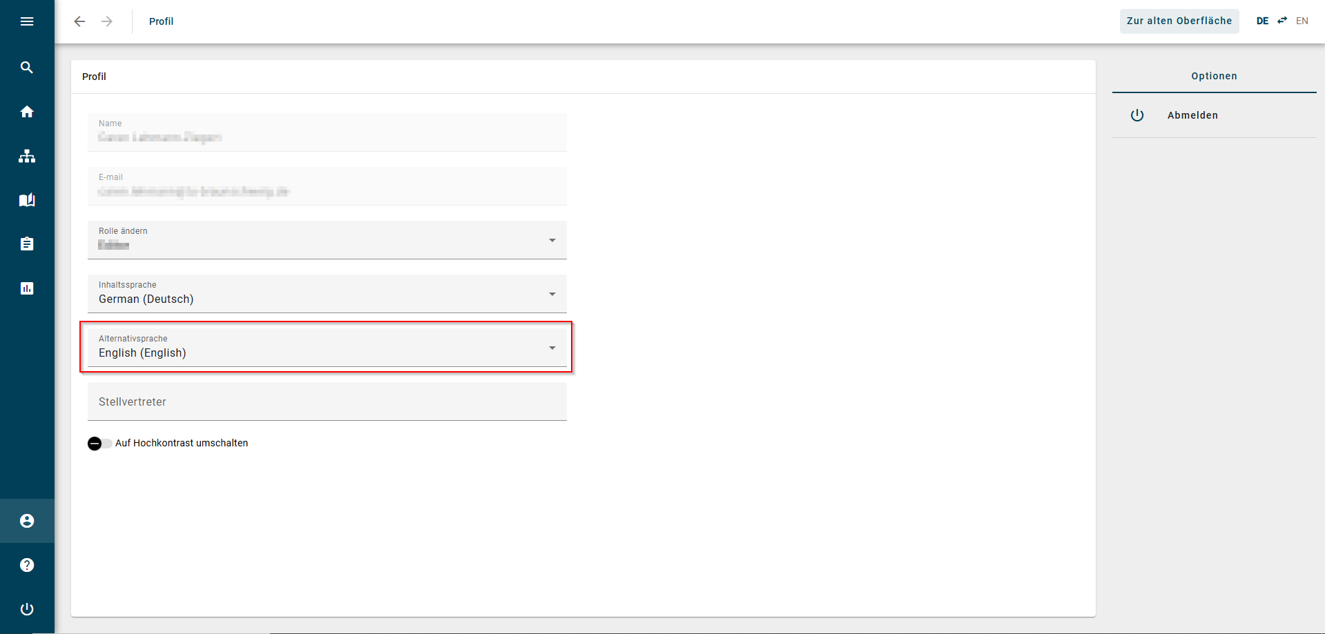 3. Im nun geöffneten Menüfenster können Sie die "Inhaltssprache" und die "Alternativsprache" einstellen. Dies müssen Sie nur einmal machen. Bitte wählen Sie bei Inhaltssprache immer "Deutsch" aus, damit die Inhalte korrekt dargestellt werden. Als Alternativsprachen wählen Sie bitte "Englisch".