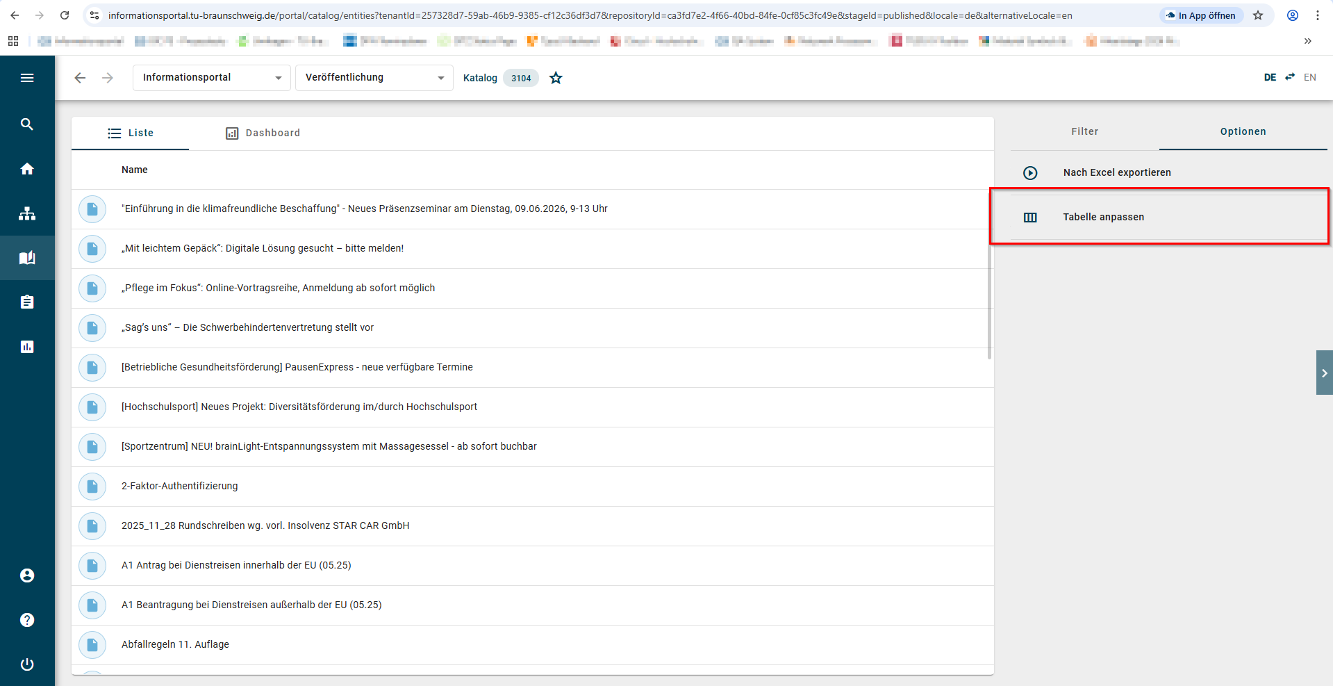 Tabellenansicht im Katalog anpassen