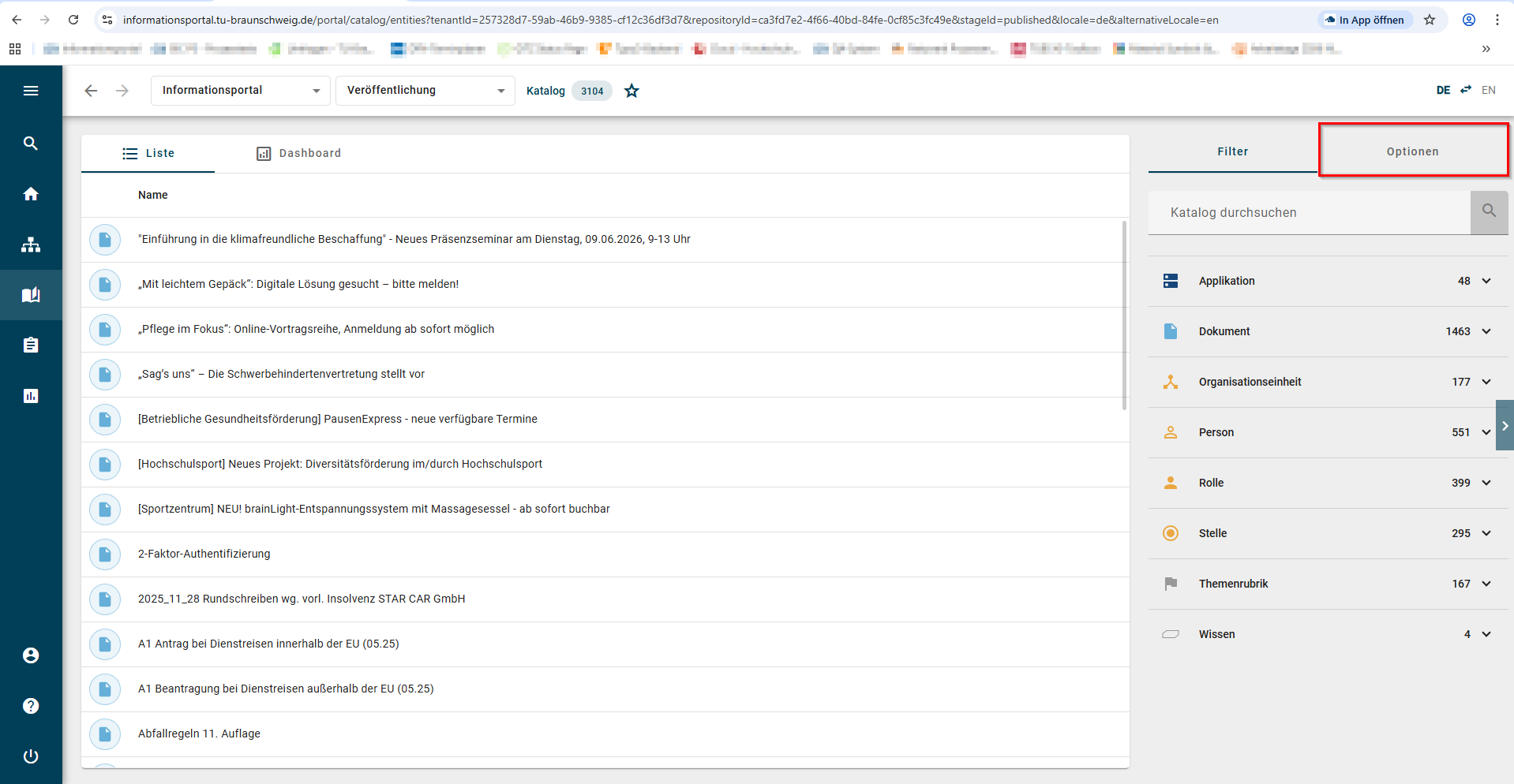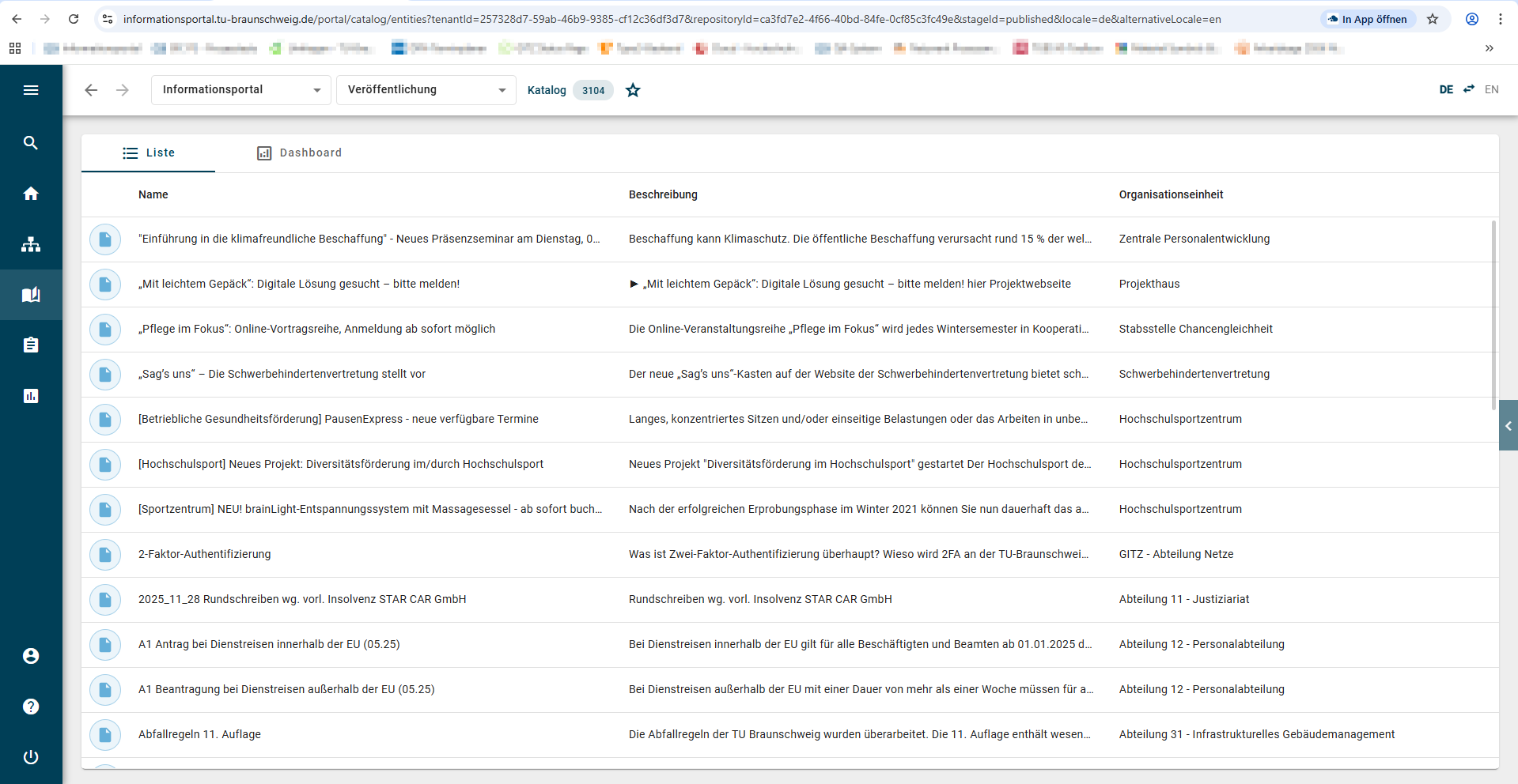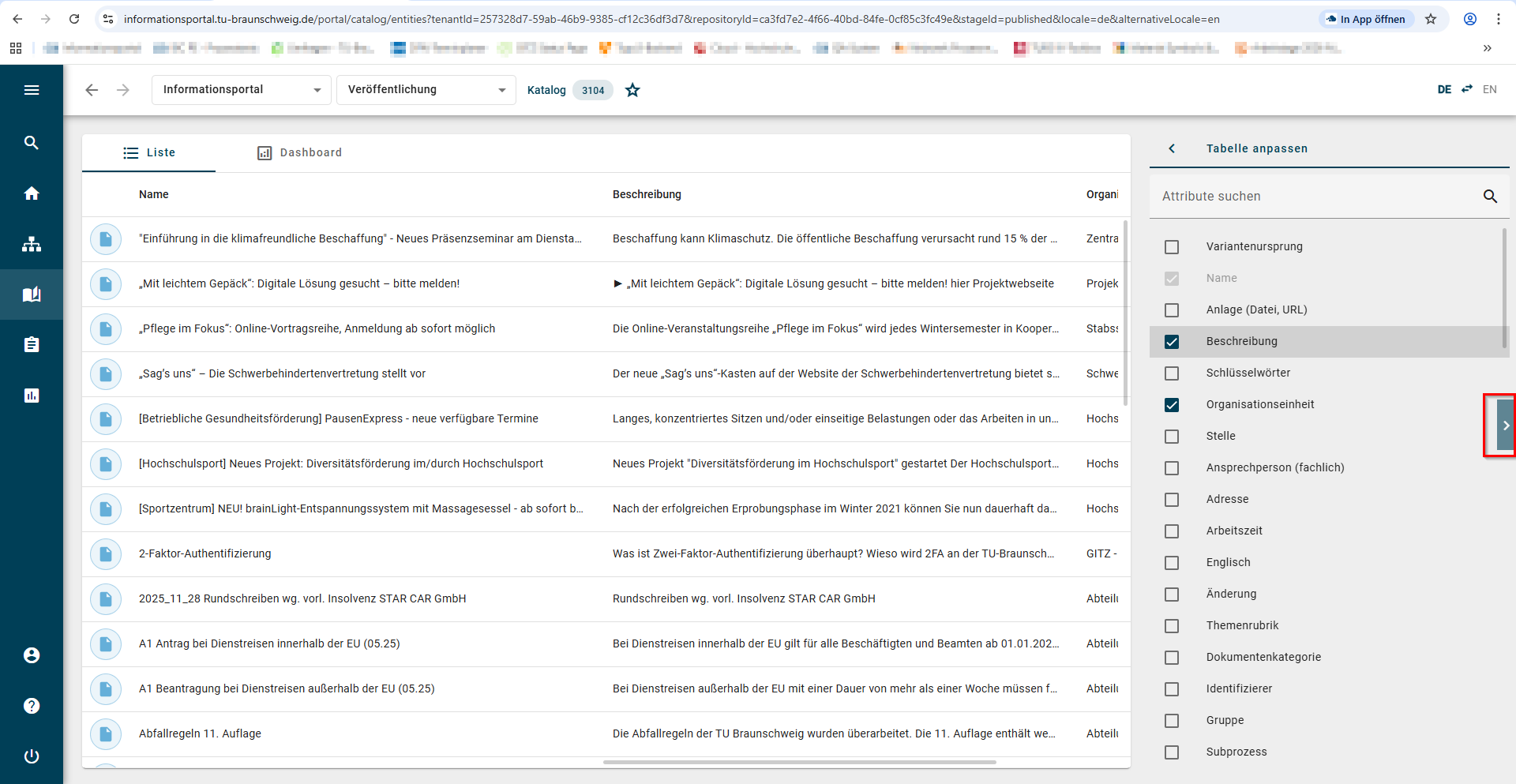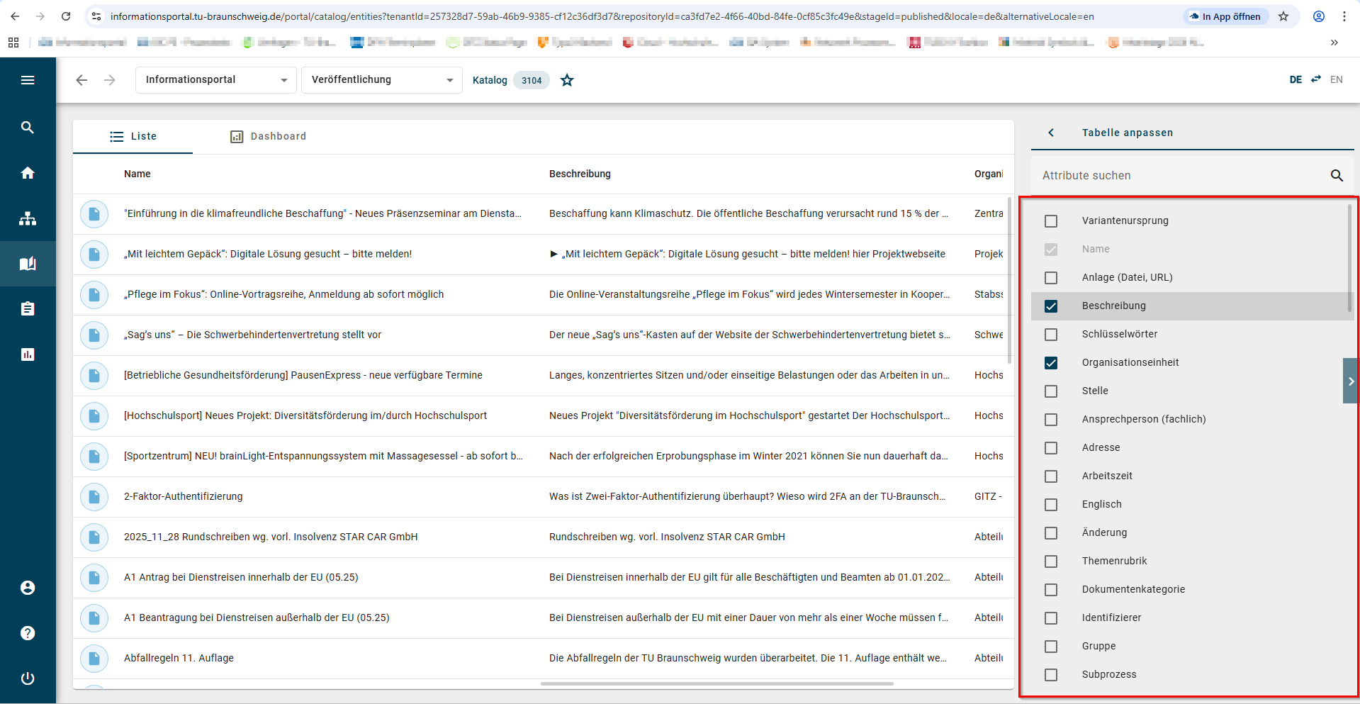 6. Der Katalog erscheint nun mit den von Ihnen angewählten Attributen ( hier Beschreibung und Organisationseinheit).