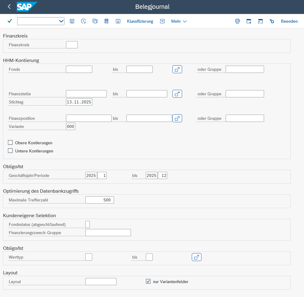 - Layout: Hier kann durch die Angabe eines Layouts die Darstellung der Daten festgelegt werden. Die Beschreibungen im nächsten Kapitel beziehen sich auf das Layout 0sapstandard. Der Haken bei „nur Variantenfelder“ bedeutet, dass nicht alle verfügbaren Spalten des Berichtes angezeigt werden. Es fehlen z. B. die Spalten mit Bankleitzahl, Bankkonto, Bankland etc. Deshalb empfehlen wir, diesen Haken zu entfernen.