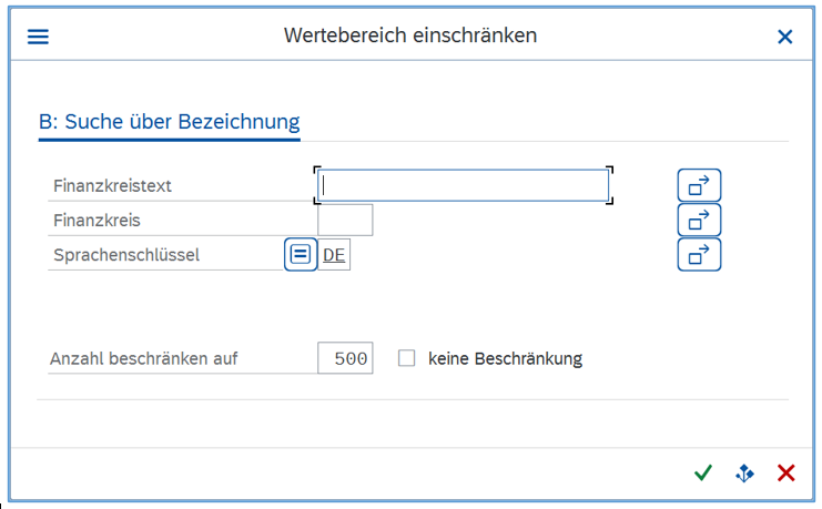 Enthält die Liste wahrscheinlich mehr als 500 Werte, sollte bei „Anzahl beschränken auf“ ein HAKEN bei „keine Beschränkung“ gesetzt werden. Es werden dann alle vorhandenen Werte angezeigt (betrifft z. B. Finanzstellen, Fonds oder Finanzpositionen).