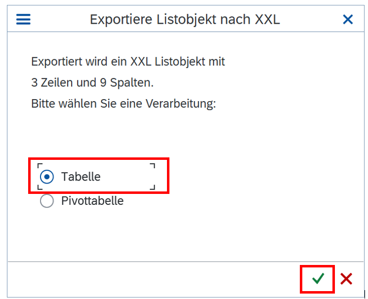 Nach Auswahl von Seite an XXL übergeben hat man die Wahl zwischen Tabelle und Pivottabelle: