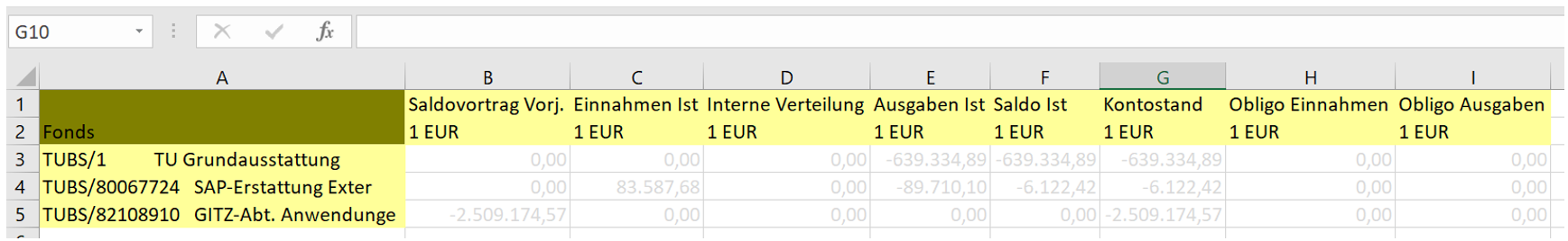 Anschließend wird Excel geöffnet und man sieht den exportierten Bericht, z.B. nach Fonds dargestellt: