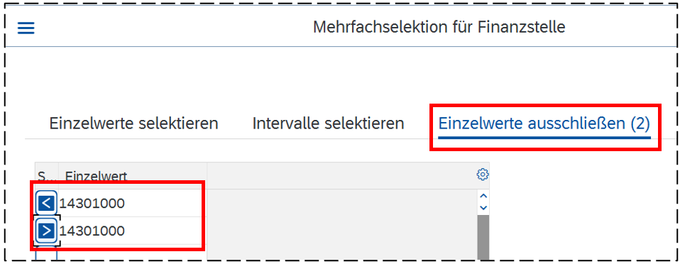 Wichtig: Bei Finanzstellen oder Finanzpositionen dürfen die Registerkarten Einzelwerte selektieren und Intervalle selektieren keine Einträge enthalten.