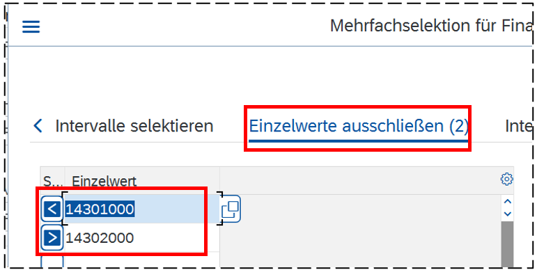 Beispiel: Selektion der Kostenstellen 14301000 und 14302000