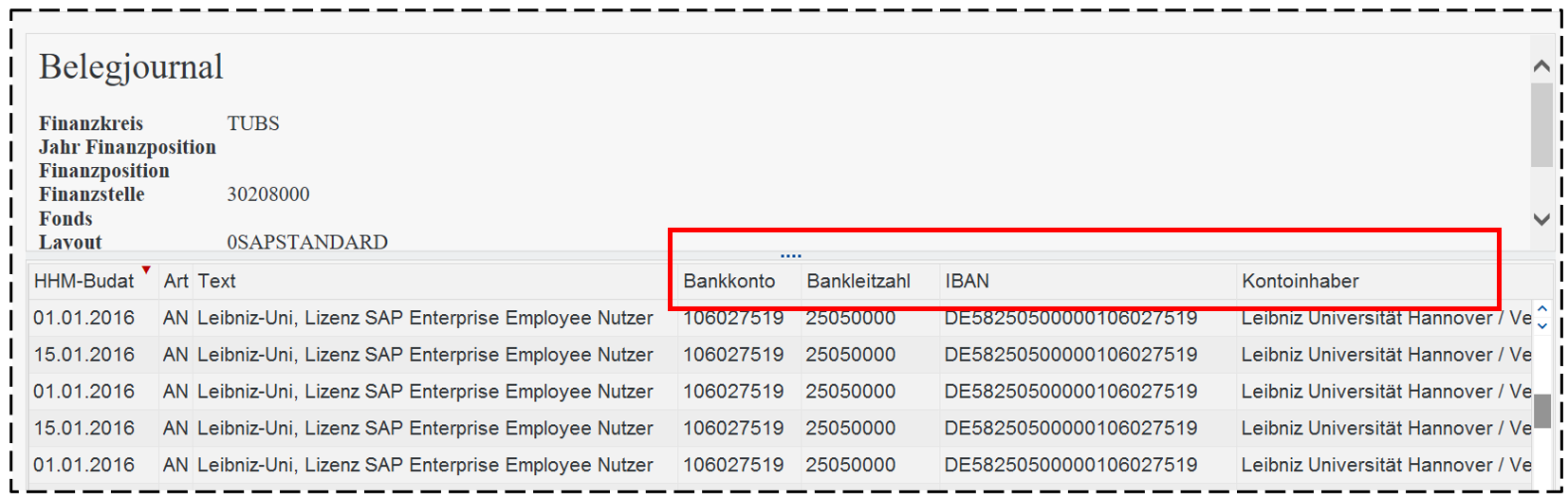 Eine Zahlung ist erfolgt, wenn im Bericht Alle Buchungen oder Haushaltsmanagement nach Erfassungsdatum in der Spalte Ausgleichsdatum ein Datum eingetragen ist. In den Spalten Bankkonto, Bankleitzahl (Spaltenüberschrift: Bnkleitz.), IBAN und Kontoinhaber findet sich die Bankverbindung, auf die das Geld überwiesen wurde.