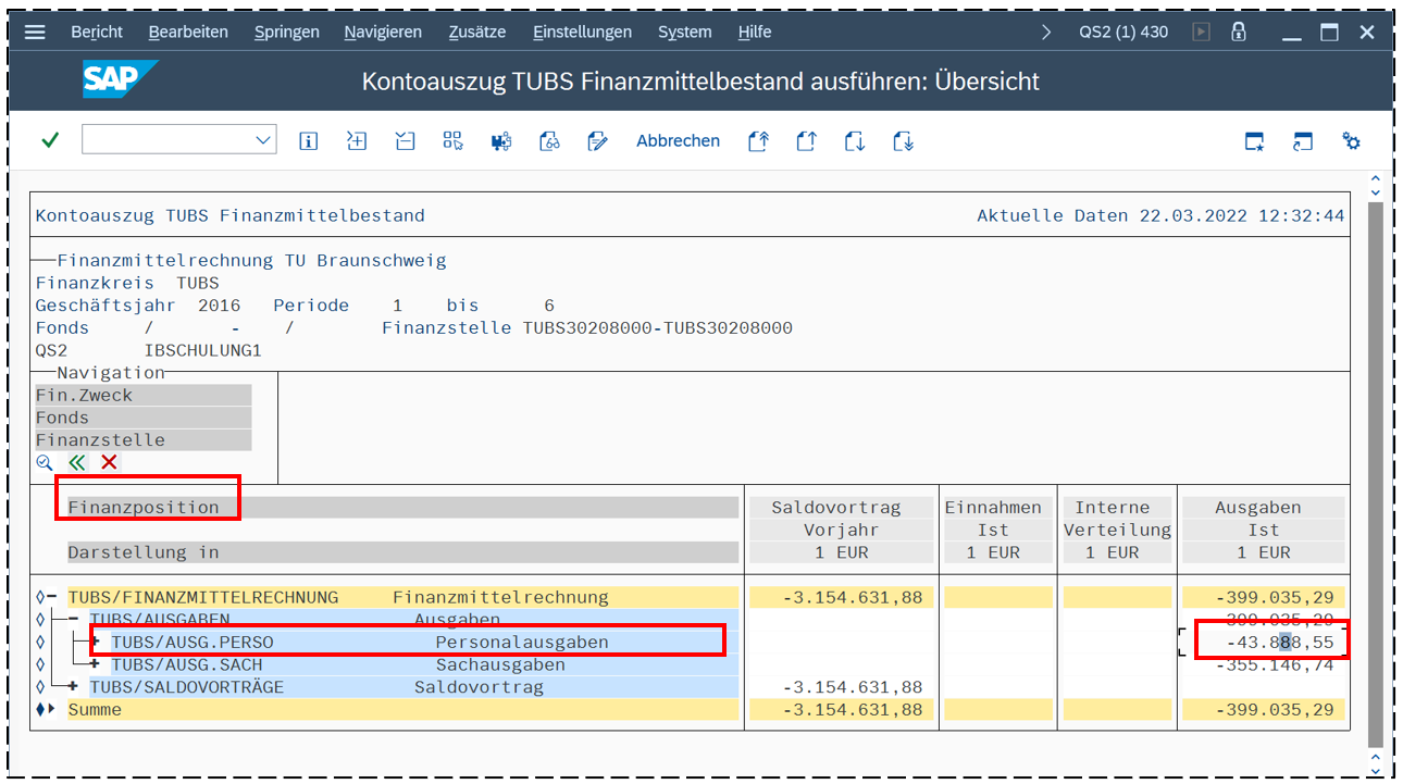 Den Bericht Kontoauszug Finanzmittelbestand oder Kontoauszug Finanzmittelauswertungen aufrufen (Achtung: „negative“ Selektion!!!), Darstellung nach Finanzposition wählen, Expandieren bis Zeile Personalausgaben sichtbar ist, z.B. mit