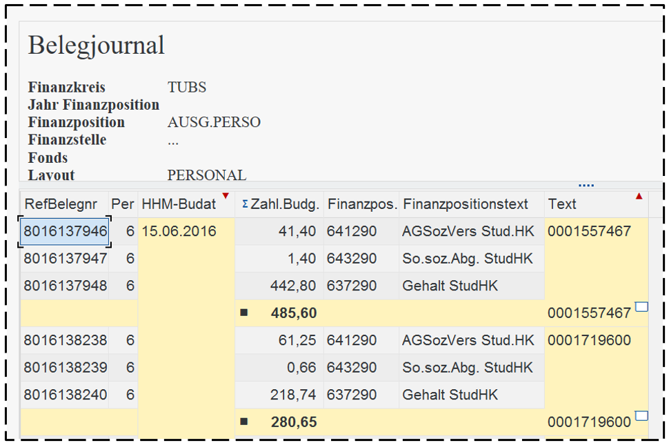 Über das Menü Zusätze - Einzelposten in das Belegjournal wechseln. In der Spalte Text ist die Personalnummer und der Name zu finden. Deshalb ist dann ein Layout mit Zwischensumme auf die Spalte Text zu empfehlen: