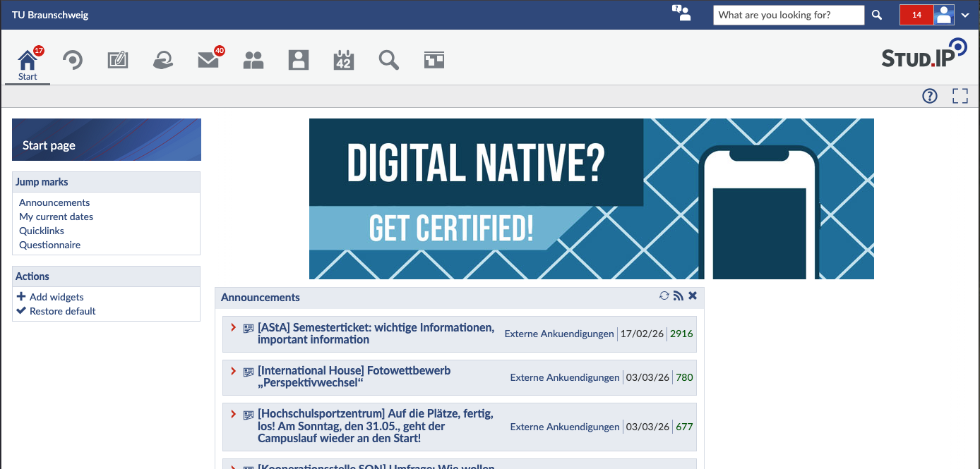On the Stud.IP start page, you can publish announcements, for example to draw attention to events.