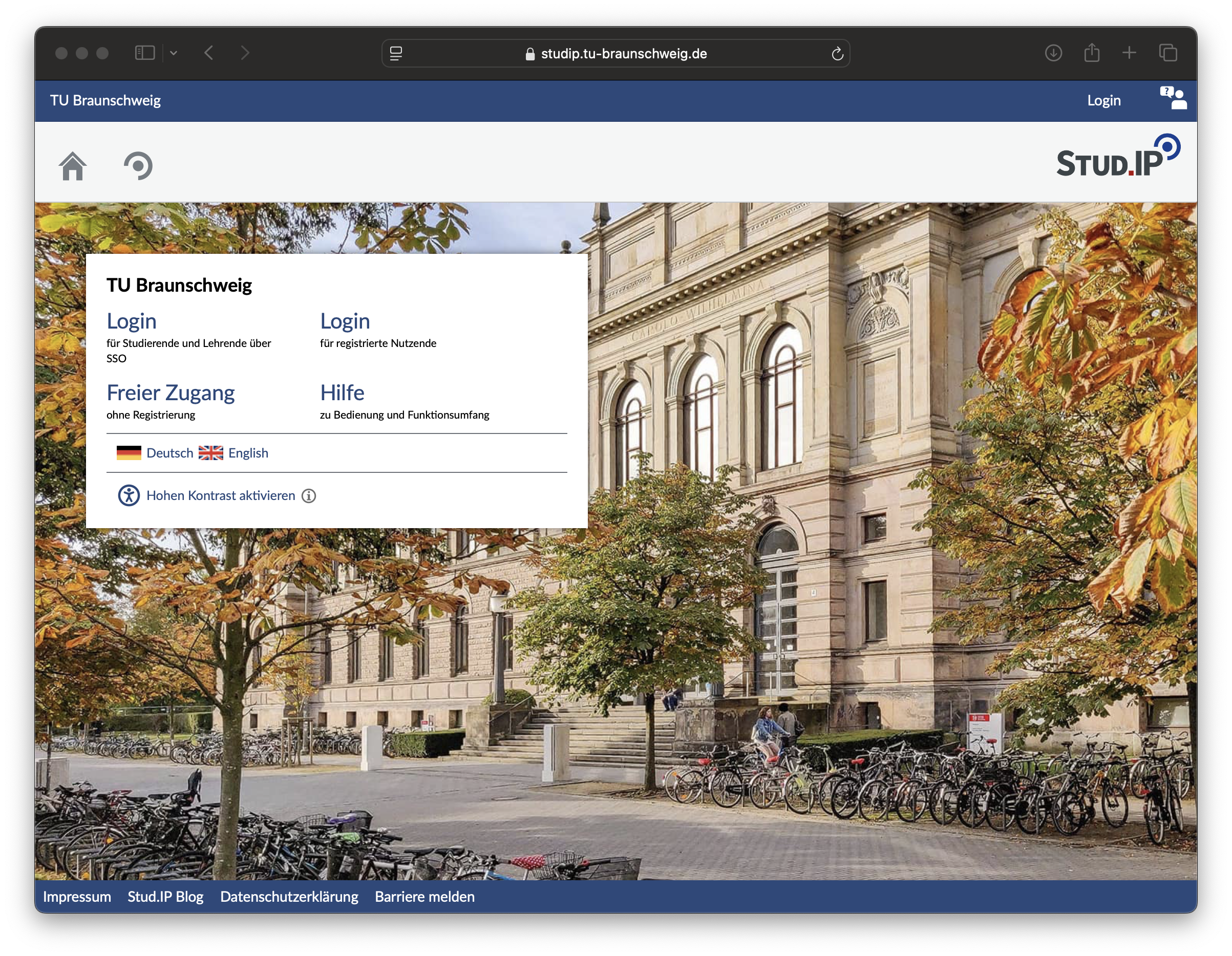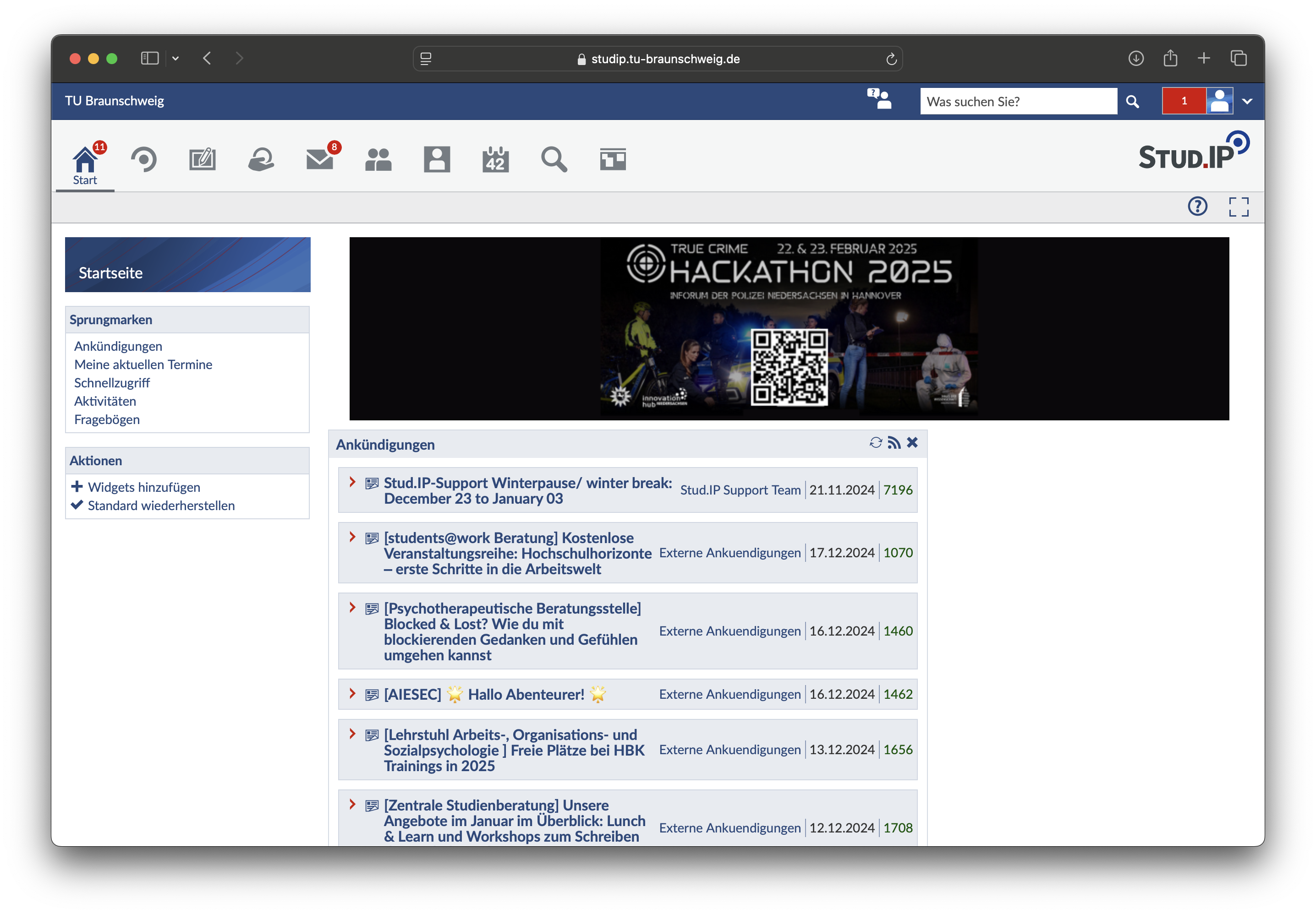Nachdem Sie sich mit Ihren Zugangsdaten in Stud.IP angemeldet haben, gelangen Sie zur Startseite.