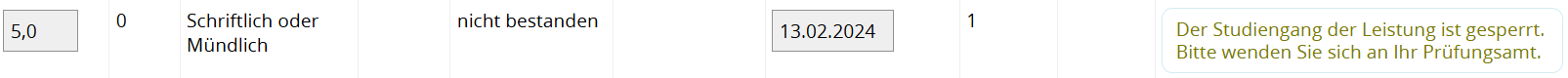 Sie sehen in der Spalte Meldungen den Hinweis: "Der Studiengang der Leistung ist gesperrt. Bitte wenden Sie sich an Ihr Prüfungsamt."
