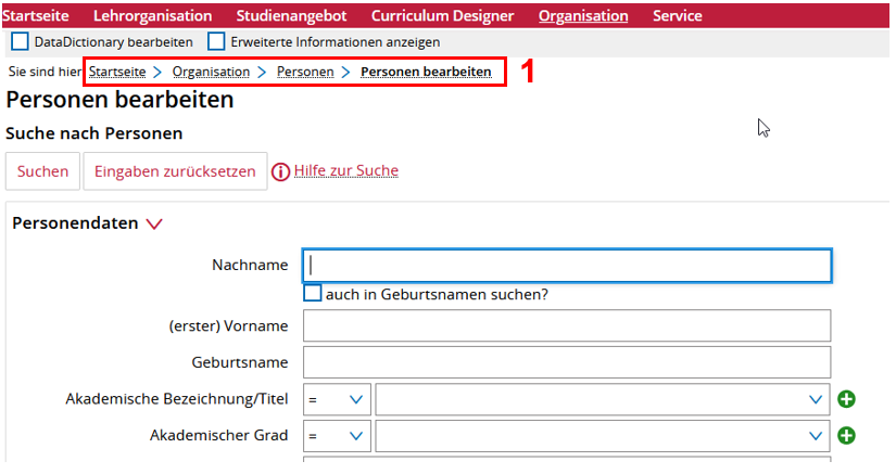 (1) Personen bearbeiten öffnen - Man kann nun nach einer konkreten Person suchen oder man klickt einfach ohne Angabe von Personendaten auf den Button "Suchen" > Dann erhält man als Ergebnisliste nur die Personen seiner Organisationseinheit (OE) bzw. der untergeordneten OEs, falls vorhanden.
