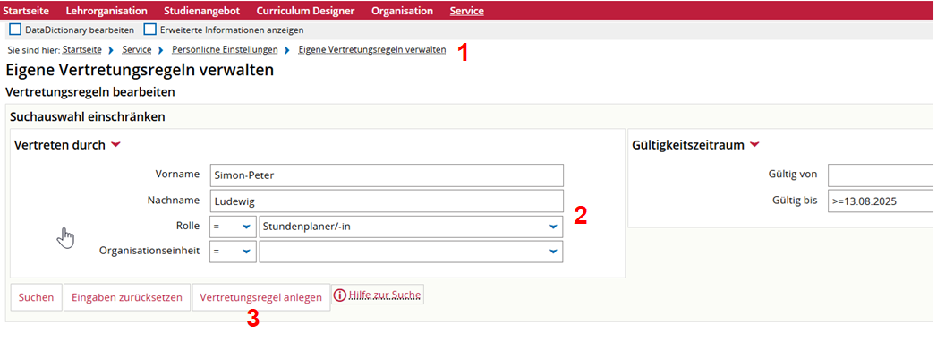 Aufruf der Funktion: [Service] > [Persönliche Einstellungen] > [Eigene Vertretungsregeln verwalten]
