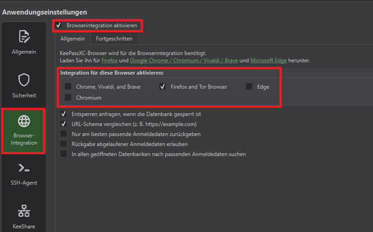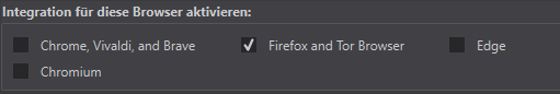 Select the „Browserintegration“ option and enable the top checkbox („Browserintegration aktivieren“). Then select the browser of your choice.