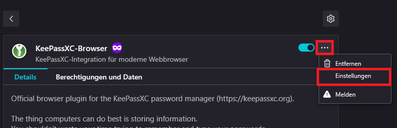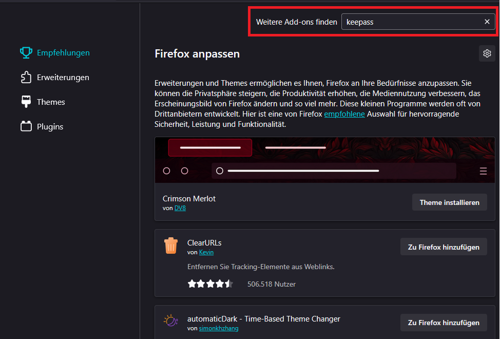 Next, continue in the selected browser. First, add the KeePass plugin if it is not already installed.