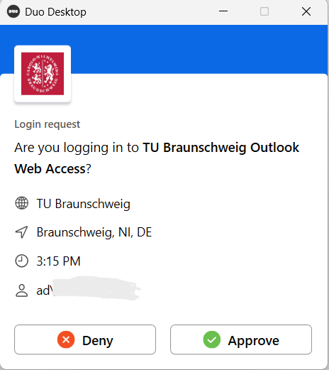 Verify the accuracy in the Duo app, paying particular attention to the requesting application (OWA/VPN/etc.) and to your TUBS ID in the field "<Ihre Kennung>" in the lower area next to the Person icon.