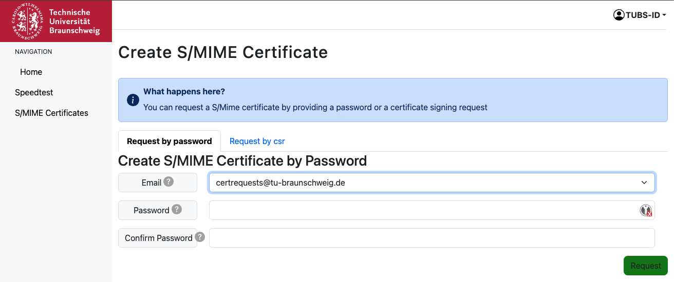 Um ein Zertifikat mit Eingabe eines Passwortes zu beantragen, wählen Sie bitte eine Email-Adresse aus. Nur personenbezogene Email-Adressen sind berechtigt und werden hier aufgelistet. Fehlt eine Ihrer Email-Adressen, wenden Sie sich bitte per Email an noc@tu-braunschweig.de. Im Folgenden vergeben Sie bitte ein Passwort und geben es ein zweites Mal ein. Bitte verwahren Sie dieses Passwort sicher. Sie benötigen es, um das Zertifikat später in den Zertifikatsspeicher ihres Betriebssystems zu importieren.