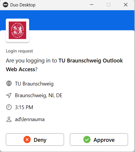 ![]() | Überprüfen Sie die Richtigkeit in der Duo App, achten Sie speziell auf die anfragende Applikation (OWA/VPN/etc.) und auf Ihre TUBS-ID im Feld "<Ihre Kennung>" im unteren Bereich neben dem Icon Person. |