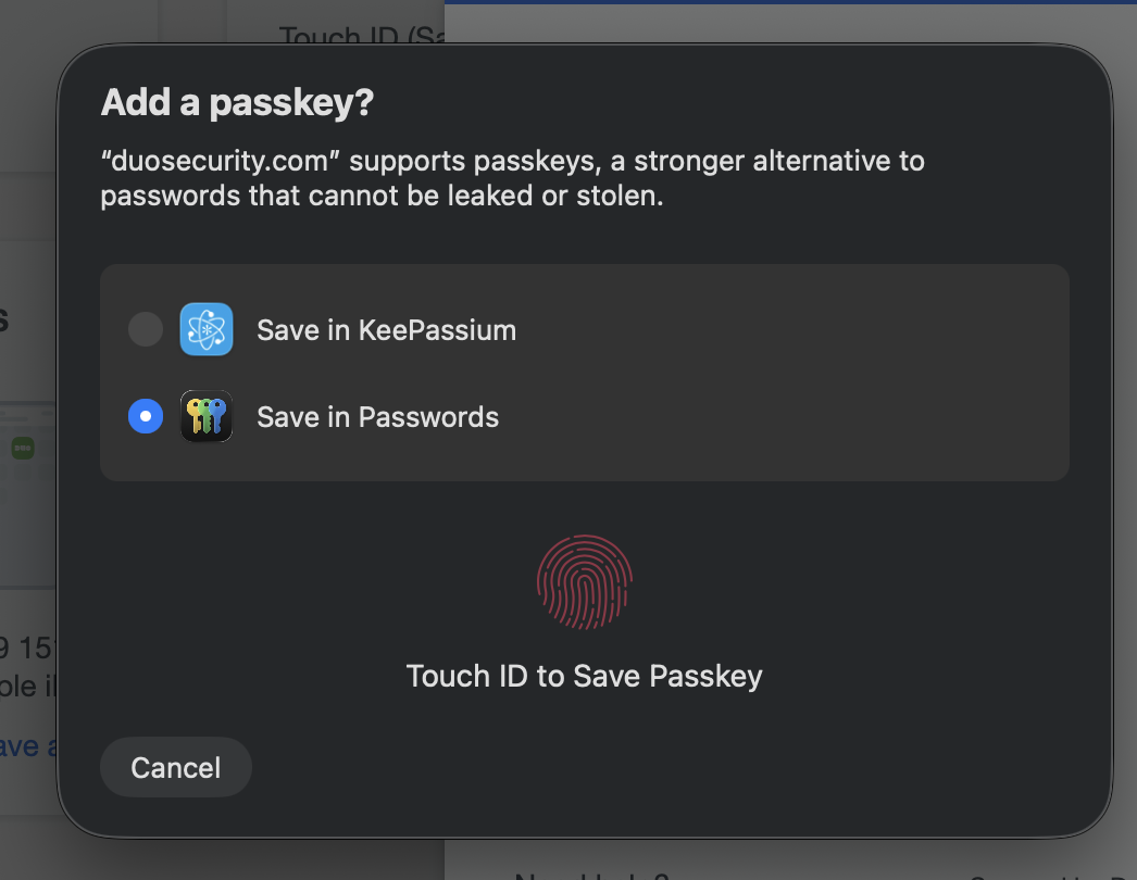 Wenn Sie sich für die Speicherung in Apple Passwords entscheiden und mit einer Apple ID eingelogged sind können Sie den Passkey auch auf anderen Geräten mit der selben Apple ID nutzen, dies gilt ebenfalls in anderer Reihenfolge bei Einrichtung auf einem iPhone und Nutzung auf einem Mac.