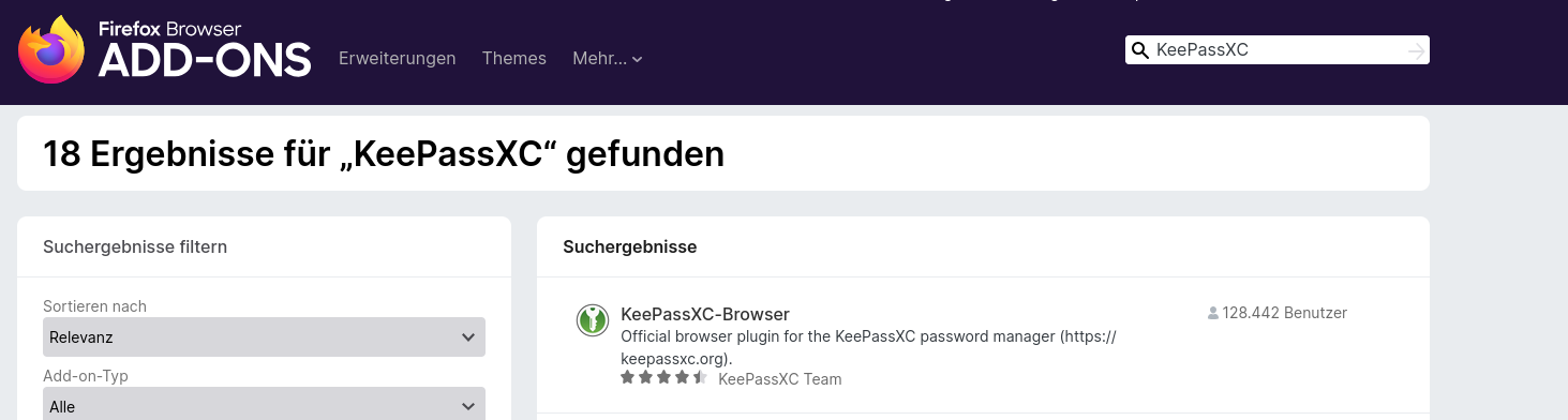 Als nächster Schritt wird im ausgewählten Browser fortgefahren. Installieren Sie im Browser die Erweiterung „KeePassXC-Browser“, falls diese noch nicht vorhanden ist.