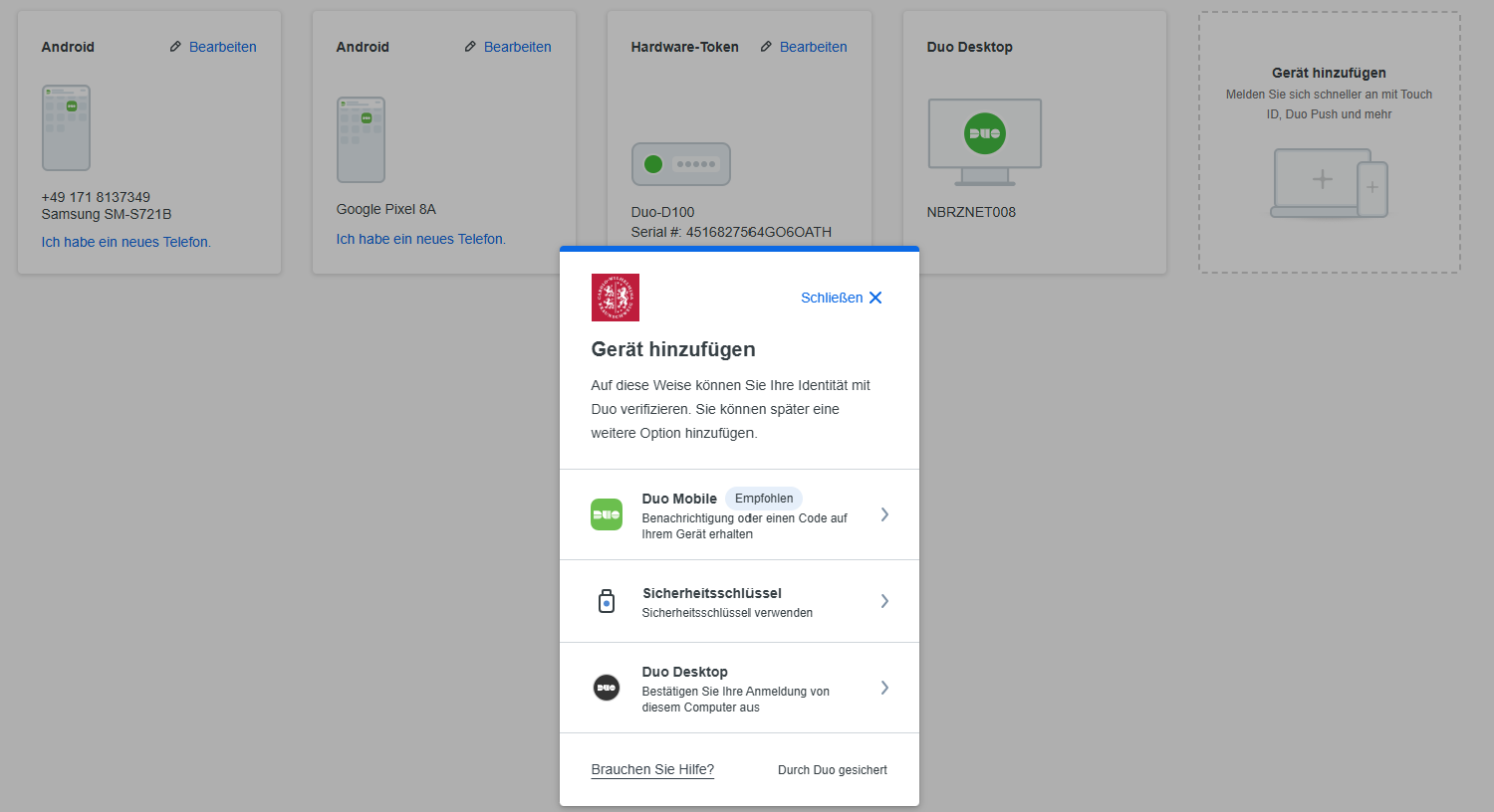 Sie können unterschiedlich viele zweite Faktoren hinzufügen, so auch einen Yubikey. Hierfür müssen Sie sich in die Geräte Verwalten Seite einloggen bzw. diese öffnen. Bitte folgen Sie hierfür der Anleitung: "Geräte verwalten, neues mobiles Gerät hinzufügen oder Desktop Anwendung hinzufügen".